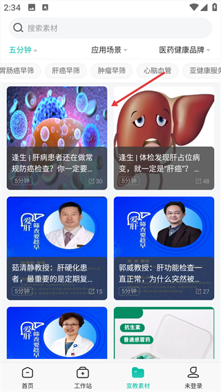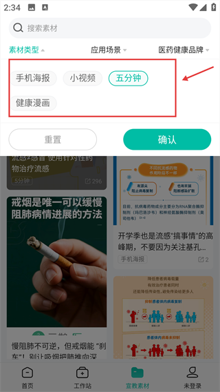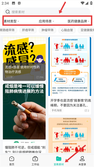 1、進入【宣教素材】頁面,通過上方【素材類型】、【應用場景】等篩選欄,進行篩選。