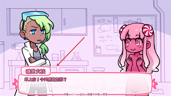 1、【糖果女孩】的對話【早上好!今天感覺怎樣?】被箭頭指向,場景為室內,底部功能鍵可操作劇情進展。