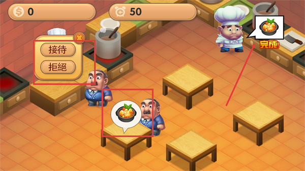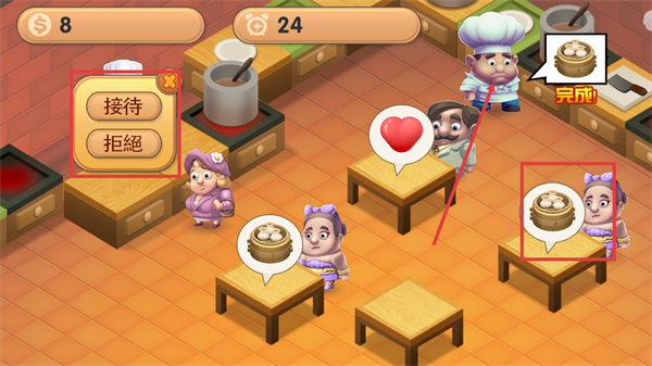 3、新顧客進店時選擇【接待】,處理【蒸餃】類訂單,完成后可觸發【完成】提示獲取額外經營獎勵。