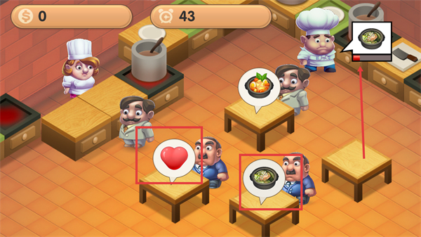 2、關注顧客頭頂的【愛心】標識,及時完成【綠色燉菜】訂單,維持顧客滿意度以避免經營評分下降影響收益。