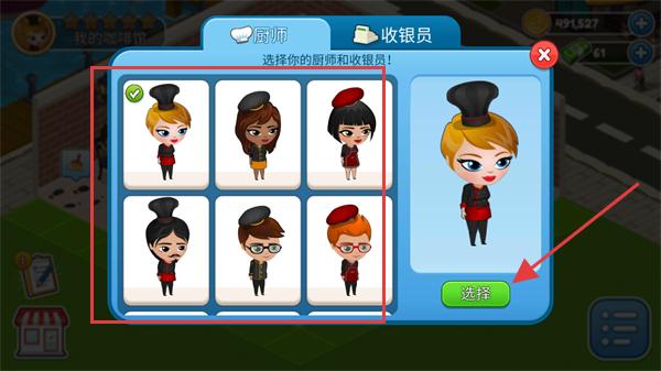 4、在廚師選擇界面,挑選心儀的廚師形象后點擊【選擇】按鈕,更換咖啡館的廚師。