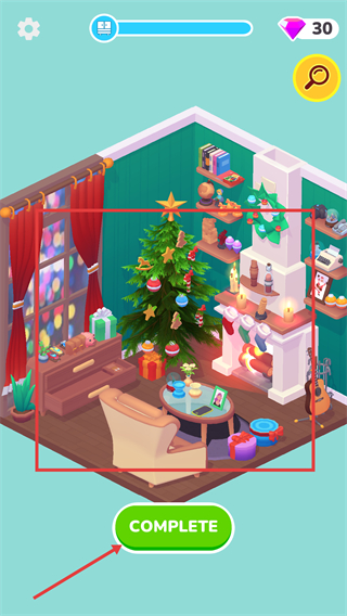 3、將所有裝飾物品擺放至對應位置,確認布置完成后點擊【COMPLETE】按鈕提交成果。
