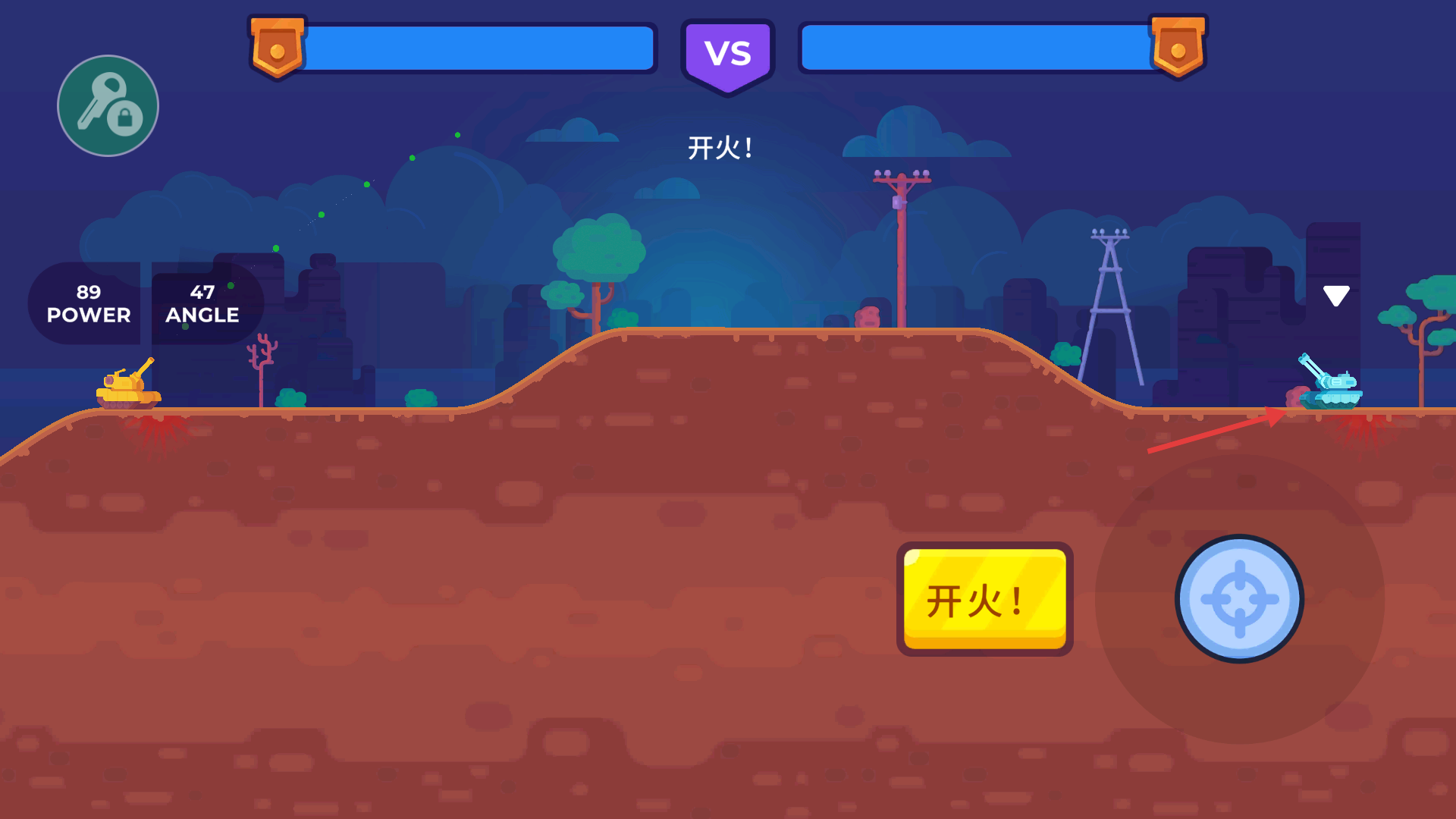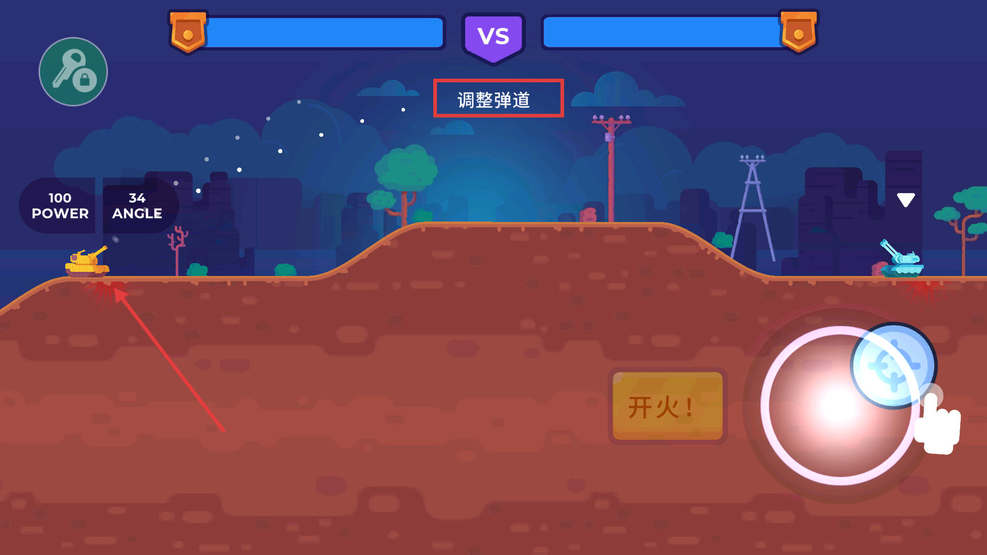 2、點擊右下角圖標調整彈道,再點擊【開火】轟炸敵方坦克