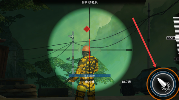 3、將瞄準鏡準星對準目標步槍兵,點擊右下角射擊按鈕完成對該目標的擊殺操作。