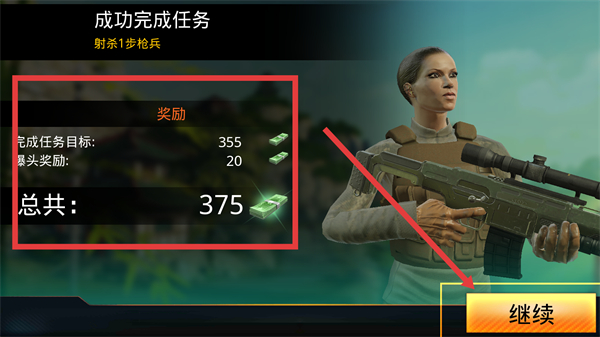 4、完成擊殺后等待任務結算界面,查看獲得的獎勵后點擊繼續按鈕返回主界面。