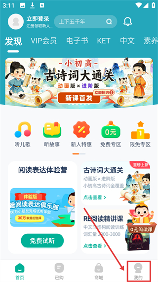 1、進(jìn)入首頁(yè)后,可點(diǎn)擊底部【我的】進(jìn)入個(gè)人頁(yè)面。