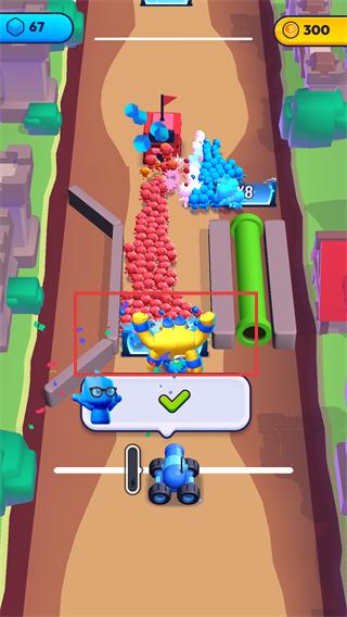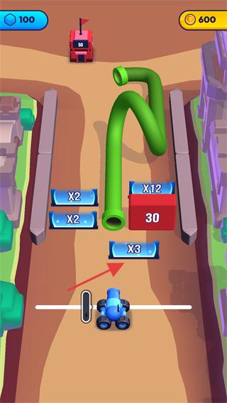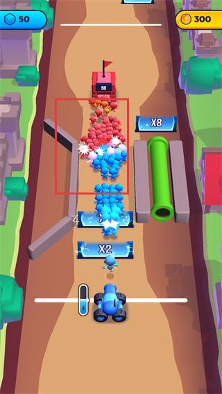 1、操控藍色小車移動,收集路徑上的【X2】【X3】等倍數道具,提升己方隊伍的人數規模。