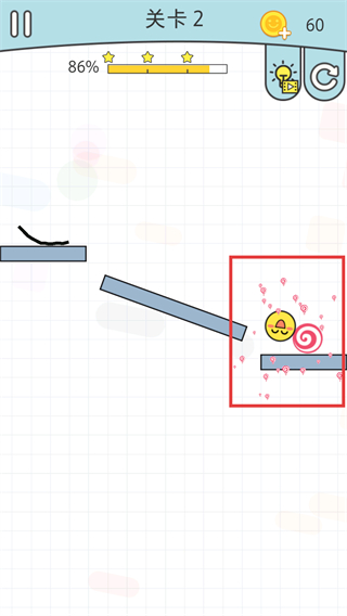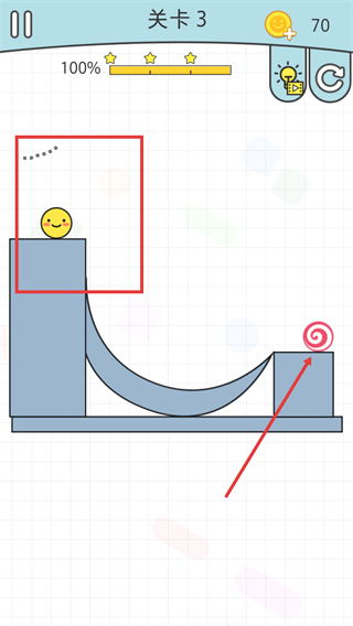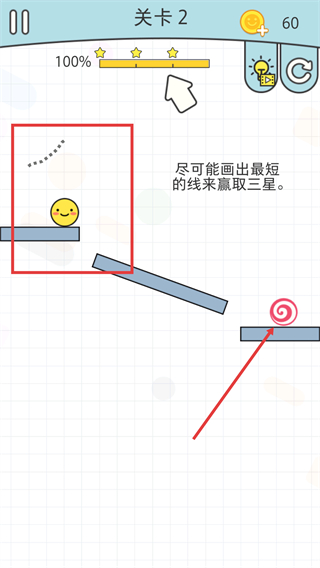 1、在【關卡2】中,觀察笑臉初始位置與斜板角度,畫合適的線引導笑臉滑行,向【糖果】移動。
