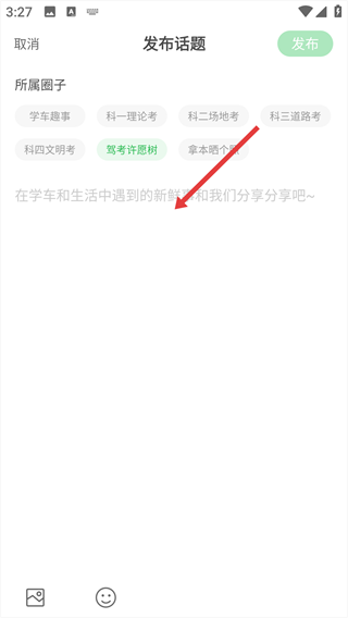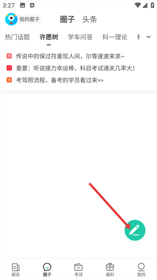 1、點擊底部“圈子”選項,切換至駕考交流圈子界面。