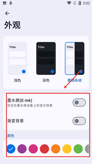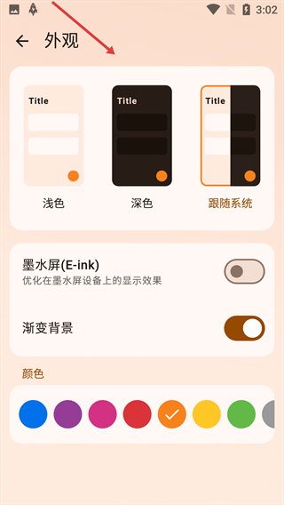 3、在外觀頁面,可選擇主題模式,同時配置“墨水屏”“漸變背景”等功能的開關(guān)狀態(tài)。