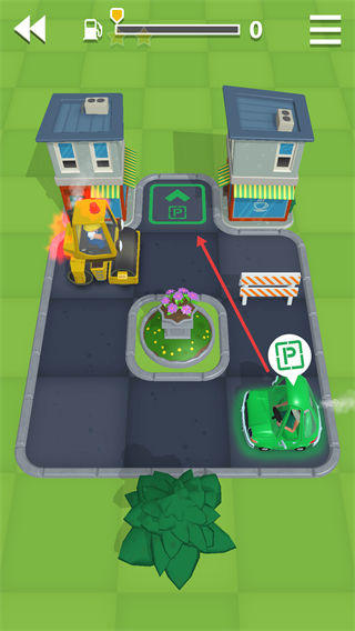 1、停車場景中綠色小車旁有【P】標識,紅箭頭指向上方停車區,左側有黃色工程車,需操控小車駛向指定停車位。