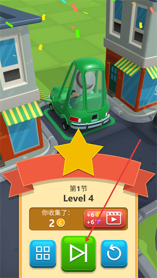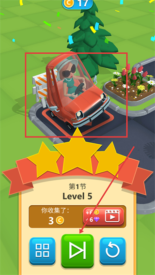 4、點擊紅箭頭指向綠色繼續按鈕,紅框標注停好的紅色小車。