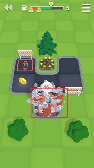 3、紅框標注洗車區域,有金幣和路障,停車區為紅色標識,需完成洗車操作。