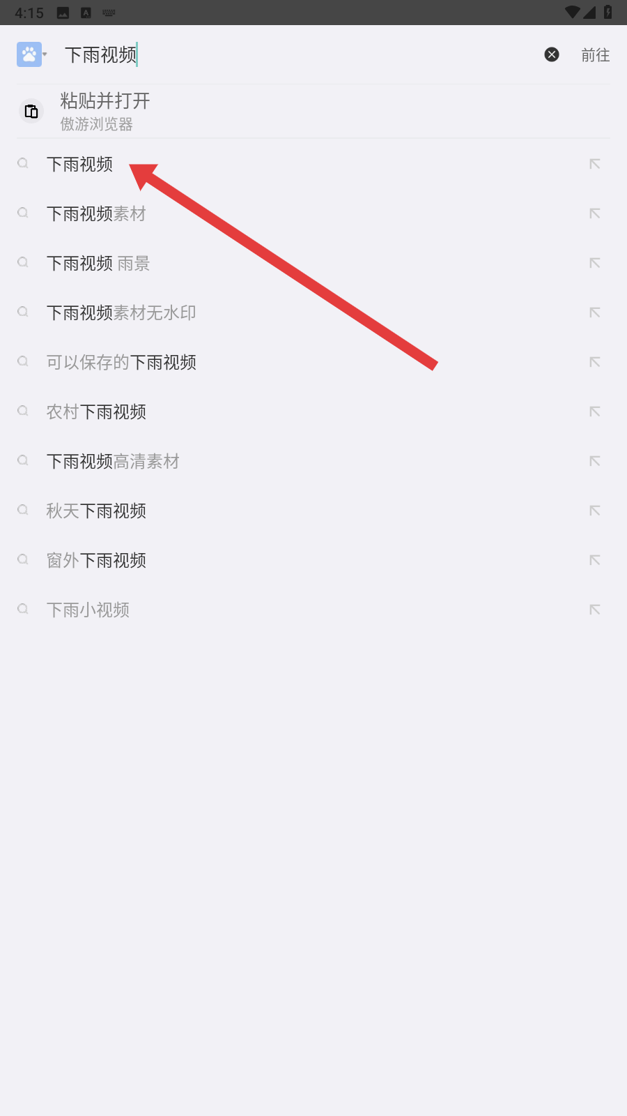 2、在搜索欄輸入【下雨視頻】,選擇對應搜索建議,快速定位相關視頻資源,推進下載進程啦。