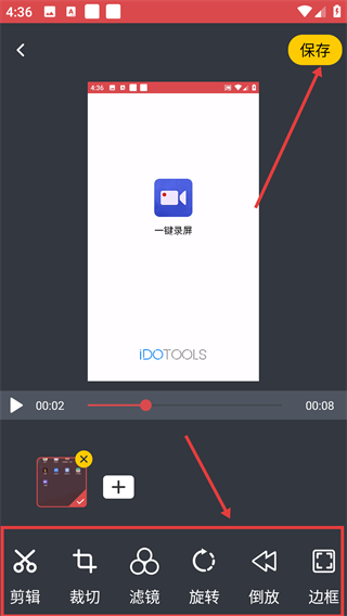 4、可使用【剪輯】【裁切】【濾鏡】等工具優化內容,完成后點擊【保存】即可導出錄屏。