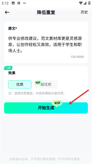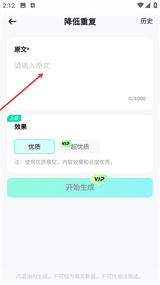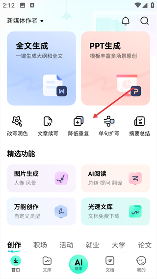 1、在app首頁,點擊【降低重復】功能選項,進入文本降重的操作頁面。