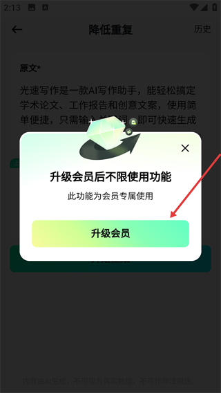 4、彈出“此功能為會員專屬使用”的提示框,開通會員后,可使用該降重功能。
