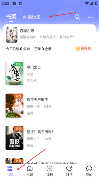 1、在書架頁面,點擊頂部的【閱讀歷史】標簽,切換到閱讀歷史頁面。