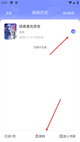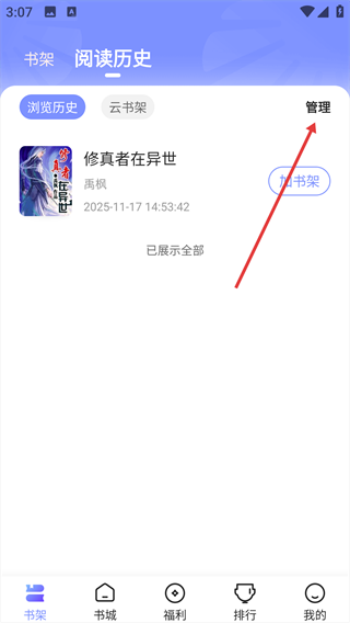 2、點擊右上角的【管理】按鈕,進入閱讀記錄管理模式。