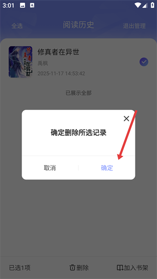 3、勾選需要刪除的閱讀記錄,點擊底部的【刪除】按鈕。