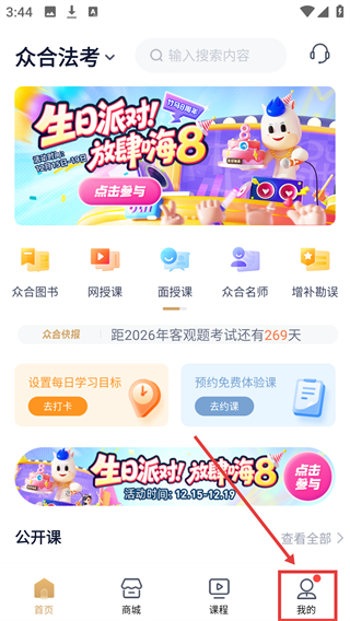 1、進入【眾合法考】首頁后,點擊底部【我的】進入個人頁面。
