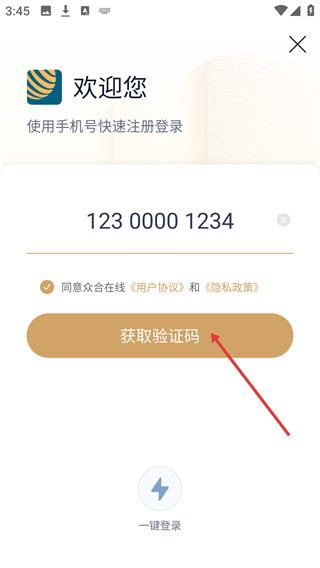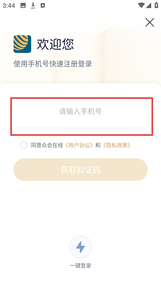 3、進入登錄彈窗后,在【請輸入手機號】框填寫號碼,需勾選【用戶協議】和【隱私政策】,才能激活【獲取驗證碼】按鈕。