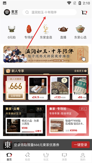 1、在東家APP首頁,點擊頂部搜索欄,進入搜索頁面。