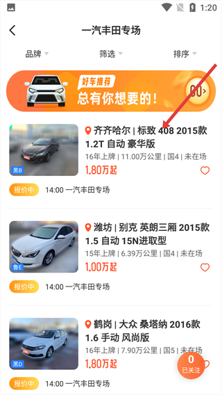 3、以專場車源為例,點擊【14:00-一汽豐田專場】,進入展示頁面。