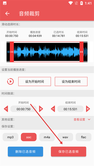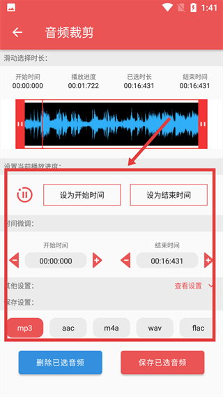 3、可通過(guò)滑動(dòng)波形或按鈕設(shè)置裁剪的開(kāi)始-結(jié)束時(shí)間,同時(shí)選擇音頻的保存格式。