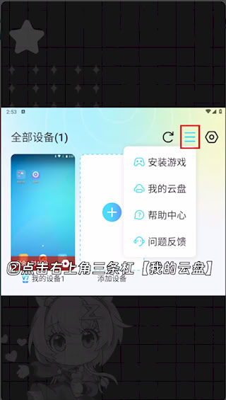 6、點(diǎn)擊右上角三條杠 【安裝游戲】或點(diǎn)擊云設(shè)備齒輪