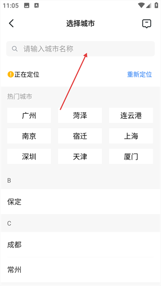 2、在城市選擇頁面的搜索框中,輸入目標(biāo)城市名稱。
