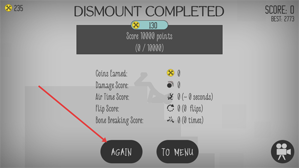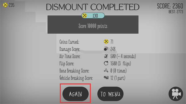 2、結算界面點擊【AGAIN】,快速重新進入游戲,繼續嘗試獲取更高分數和更多金幣獎勵。