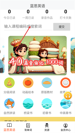 1、打開【藍思英語】APP,點擊底部【資源】按鈕,進入學習資源聚合頁面。