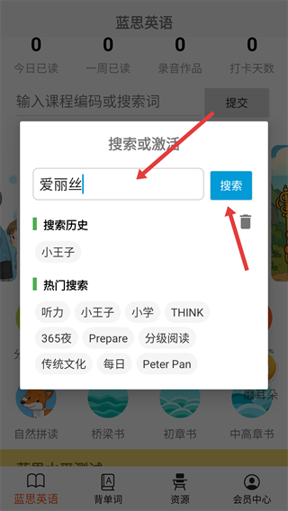 1、在【藍思英語】主界面,點擊上方搜索框。