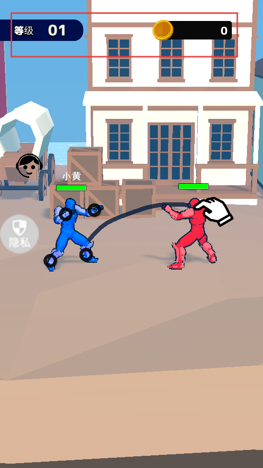 1、進(jìn)入游戲,操控藍(lán)色角色與紅色角色以繩索互動,界面顯示【等級01】【金幣0】,跟隨提示操作角色。