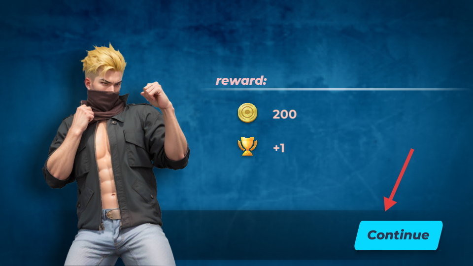 4、擊敗對(duì)手后,會(huì)獲得獎(jiǎng)勵(lì)(如200金幣、+1獎(jiǎng)杯),點(diǎn)擊“Continue”繼續(xù)游戲。