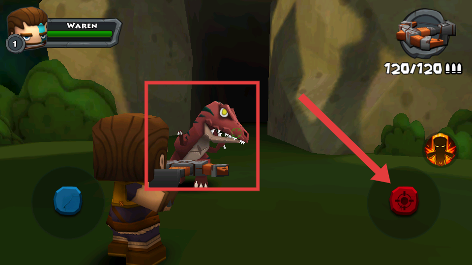 2、遇到紅框內(nèi)的恐龍時,點擊右側(cè)【紅色準(zhǔn)星】按鈕,瞄準(zhǔn)恐龍進行射擊。