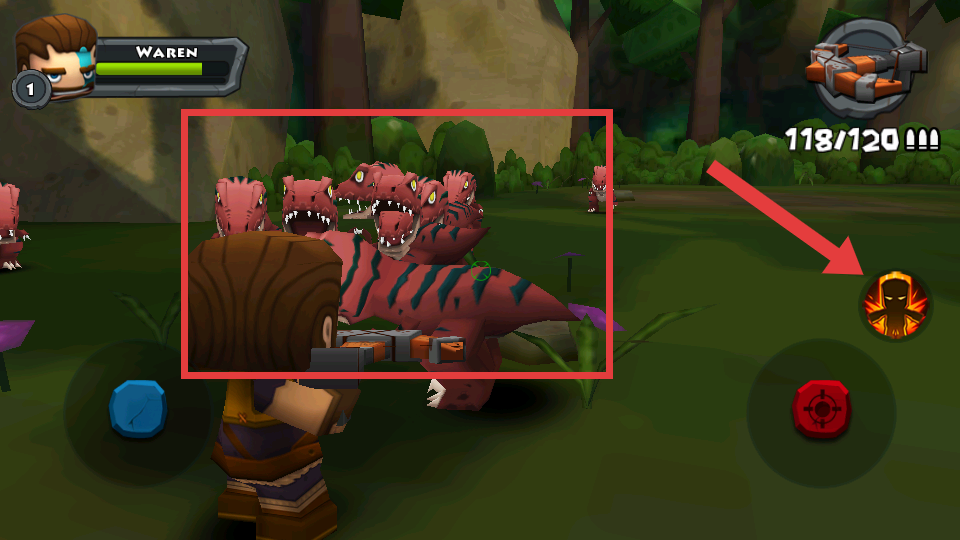 3、面對紅框內(nèi)成群的恐龍,適時點擊右側(cè)【狂暴】的技能按鈕,增加移動速度和射擊速度進行攻擊恐龍。