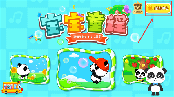 1、進入界面可看到【寶寶童謠】,界面右上角有【家長中心】按鈕可點擊。
