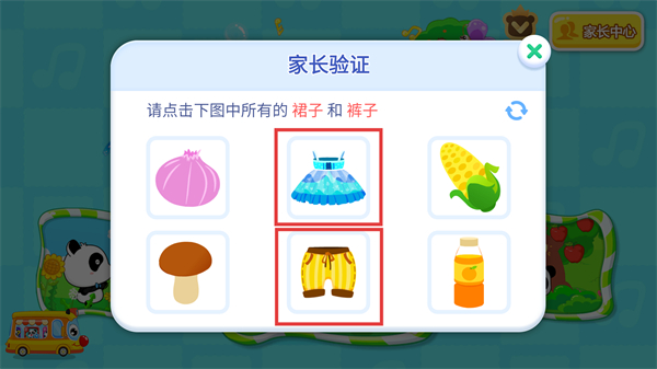 2、點擊【家長中心】后會彈出【家長驗證】,需按提示點擊圖中所有的【裙子】和【褲子】來完成驗證。