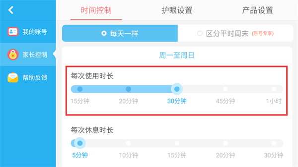 4、進入【家長控制】里的【時間控制】頁面,可調整【每次使用時長】,可選【15分鐘】【20分鐘】等時長。