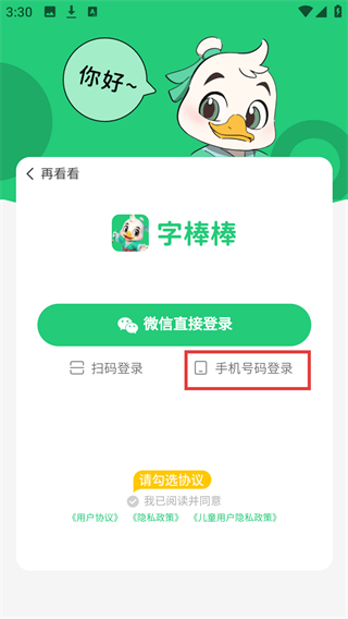 3、在登錄選擇界面,先勾選協議,再點擊【手機號碼登錄】選項,切換至該登錄方式的頁面。