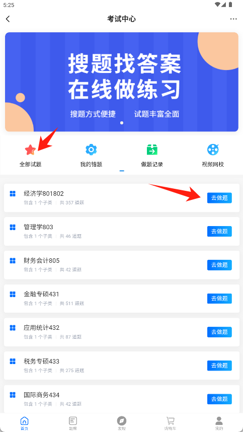 2、在考試中心頁面選擇所需科目,點擊右側藍色“去做題”按鈕。