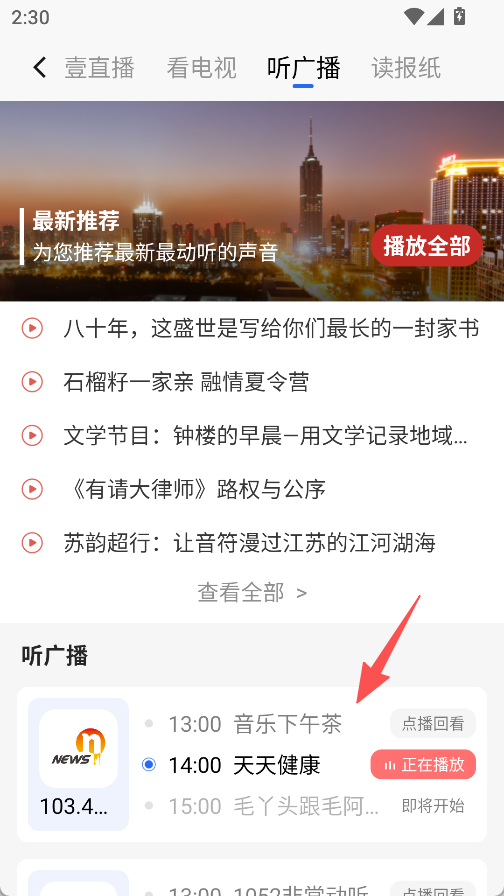 2、在軟件內打開聽廣播功能,可收聽推薦音頻與實時廣播節目。