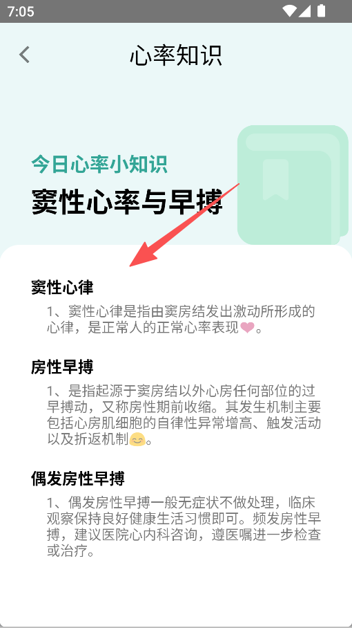 2、包含心率知識科普功能,講解竇性心率、房性早搏等內容,幫助用戶掌握心率相關的健康常識。