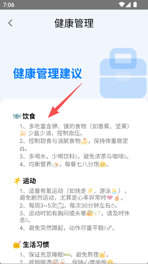 3、打開健康管理板塊,查看飲食、運動等健康建議。
