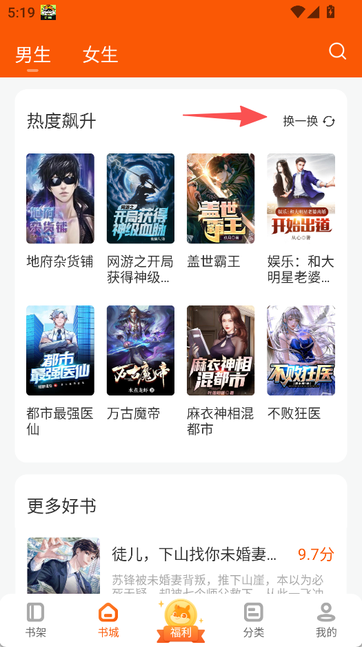 2、在熱度飆升板塊,點擊“換一換”,能獲取更多小說推薦。