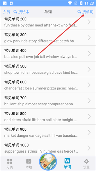 2、在單詞頁(yè)面,點(diǎn)擊右上角的【搜單詞】按鈕,進(jìn)入單詞搜索界面。