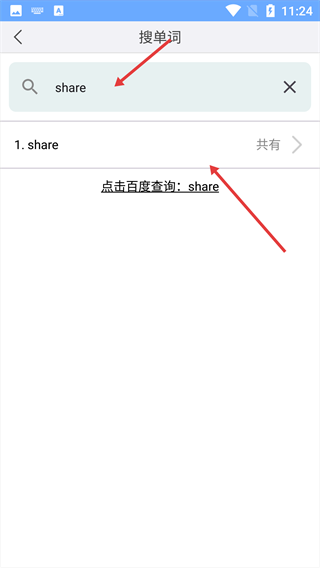3、在輸入框中填寫單詞,找到對(duì)應(yīng)的搜索結(jié)果項(xiàng)并點(diǎn)擊,進(jìn)入該單詞的詳情頁(yè)面。