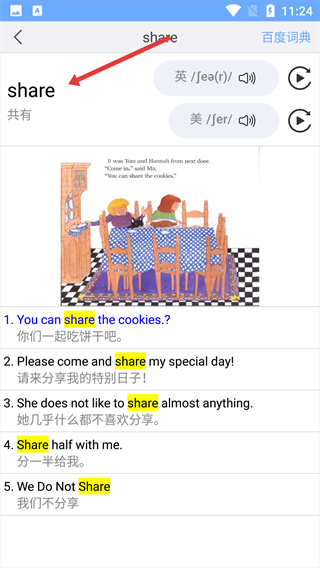 4、可查看其英/美式發(fā)音、中文釋義,同時(shí)通過繪本例句及翻譯,輔助理解單詞的實(shí)際用法。